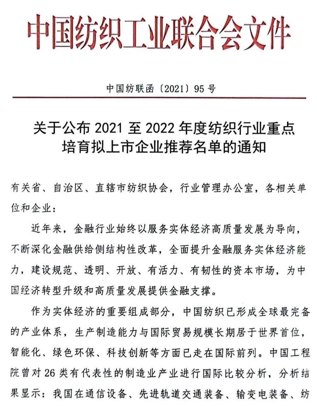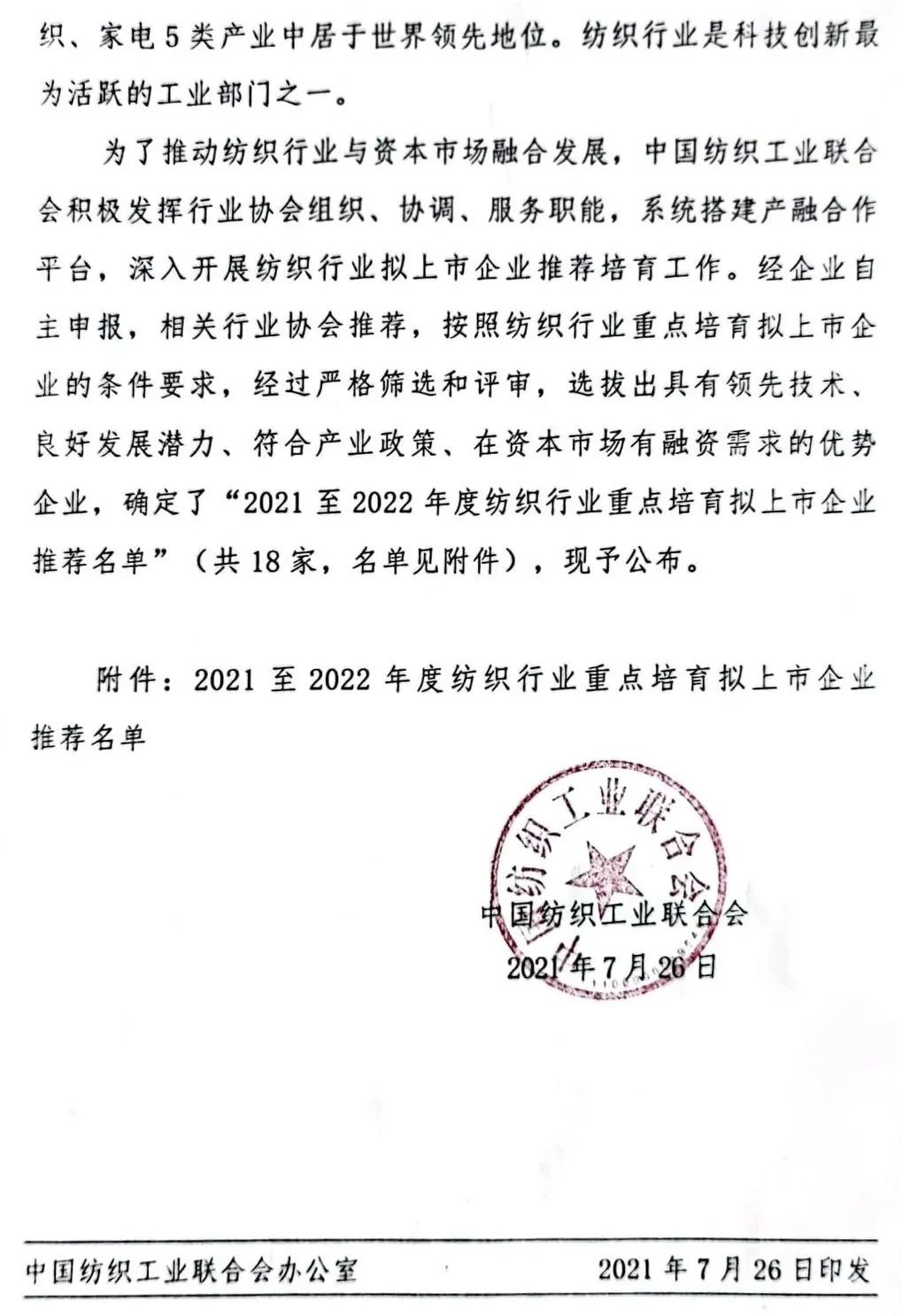 В первый год 14-й пятилетки Федерация текстильной промышленности Китая ускоряет интеграцию текстильной промышленности и рынка капитала. 26 июля Федерация текстильной промышленности Китая опубликовала уведомление о публикации рекомендуемого списка ключевых предприятий, которые будут включены в список текстильной промышленности с 2021 по 2022 год. с промышленной политикой и финансовыми потребностями на рынке капитала были выбраны для формирования рекомендательного списка. Эти предприятия включают в себя новые волокнистые материалы, интеллектуальное производство, модное строительство, экологически чистое производство, высококачественный промышленный текстиль и другие области, которые также являются ключевыми областями, поддерживаемыми текстильным «14-м пятилетним планом».